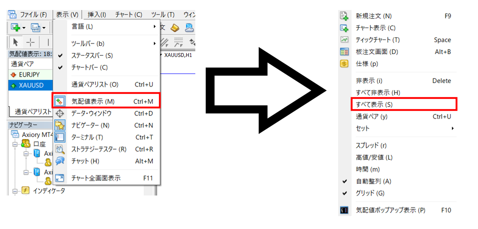「新規チャート」を押しても該当の通貨ペアが表示されない場合は、「表示」-「気配値表示」で出て来た通貨ペアリストの上で右クリックを押して「すべて表示」を押してからもう一度、「ファイル」-「新規チャート」…と探すと出てきます。