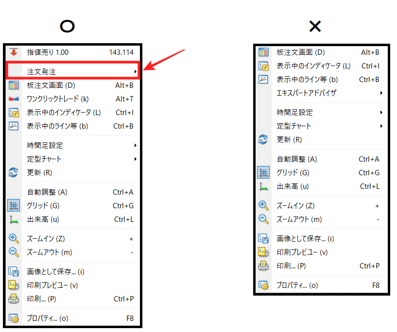 チャートの上で右クリックしてメニューを出し、その中に「注文発注」という項目があるか確認してください。