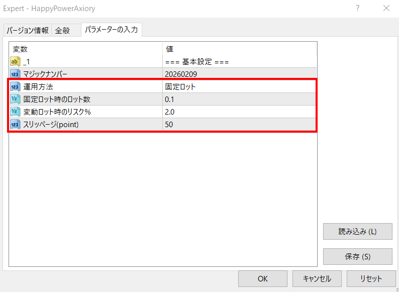 挿入すると、ドル円チャート右上に「HappyPower」と表示され、EAの設定画面が開きます。