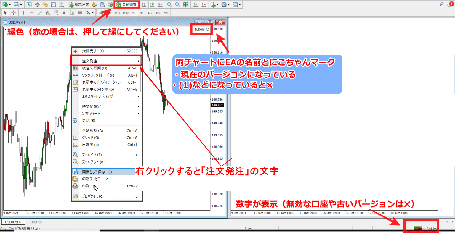 ※イレクサスEAと同時稼働する場合は、USDJPYチャートをもう1つ追加で開き、そちらにイレクサスEAを設置してください。